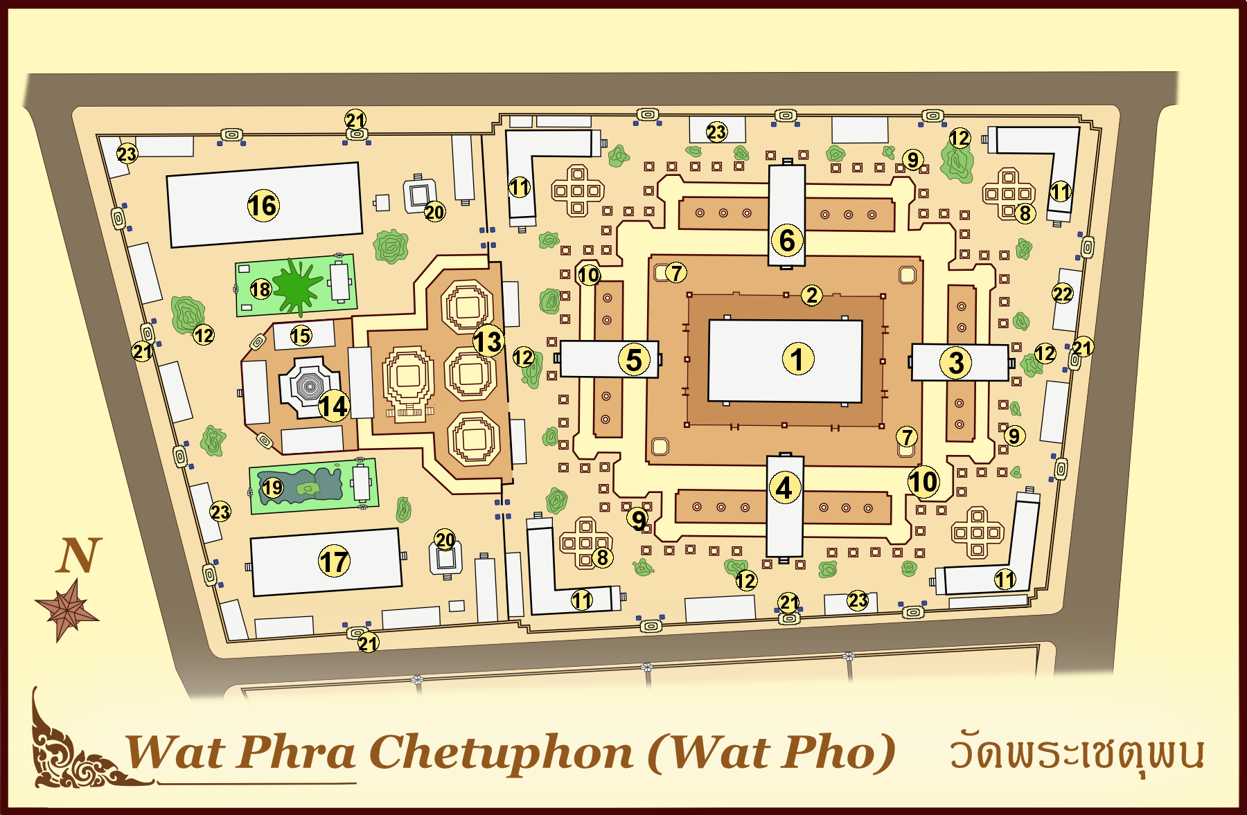 - The Wat Pho complex consists of two walled compounds bisected by Chetuphon Road running in the east–west direction